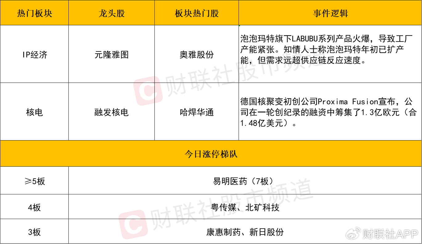 板块上,IP经济持续活跃,奥雅股份、德艺文创、厦门信达、粤传媒、哈尔斯、元隆雅图、新经典等个股涨停。消息面上,泡泡玛特旗下LABUBU系列产品火爆,导致工厂产能紧张。知情人士称泡泡玛特年初已扩产能,但需求远超供应链反应速度。