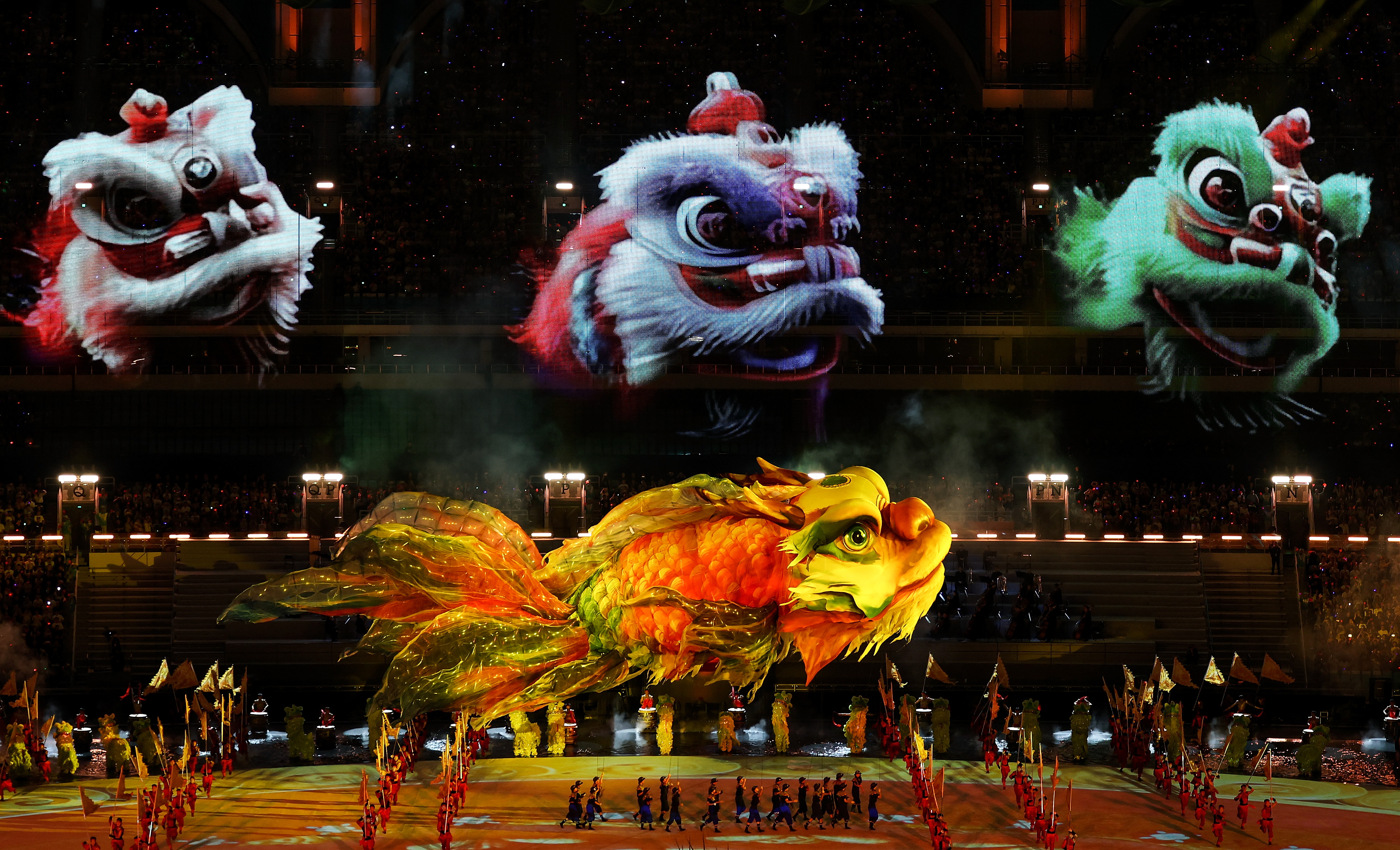 观众惊叹声中,演员们擎着的巨型鳌鱼“游入”体育场上空。锣鼓喧天里,醒狮腾跃、英歌健舞,热烈氛围盈满全场。